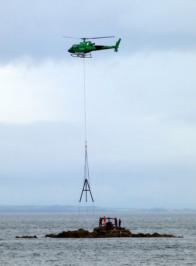 While this was being manufactured, teams of marine personnel, working around falling / low spring tides, accessed Mucks Rock and carried out measuring and drilling operations (using pre-fabricated templates) to ensure the depth of holes necessary to hold the structure could be achieved.